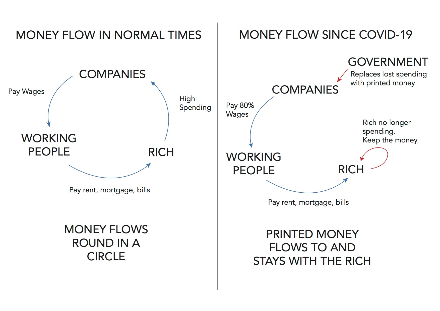 Who are the winners and losers here? Working people receive their incomes from the government, although they lose out a bit as their incomes are not fully subsidised. The rich also end up with the money they would have received anyway via rents, interest and corporate incomes. Crucially, however, the spending of the rich has decreased massively. This means that the rich end up profiting as their income has stayed the same but their outgoings have fallen.
