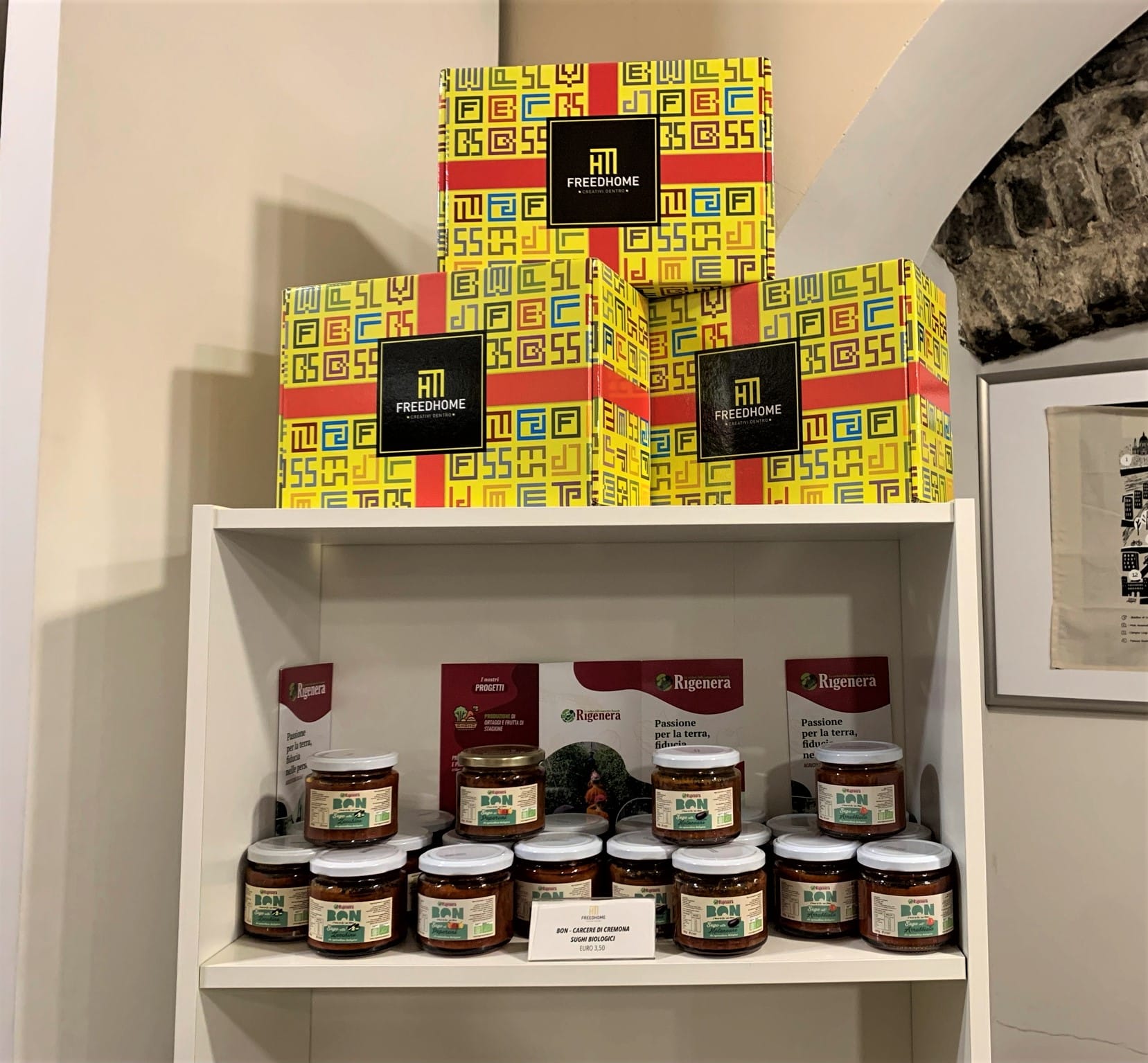 The shelves at Freedhome are lined with colourful tote bags, laptop cases, hats, chef’s aprons and other garments. You can also buy wine and food, including olive oil, honey, dried herbs and biscotti. One display features artisanal pasta sauces, preserves and pickled vegetables made inside a prison in Cremona, south of Milan.