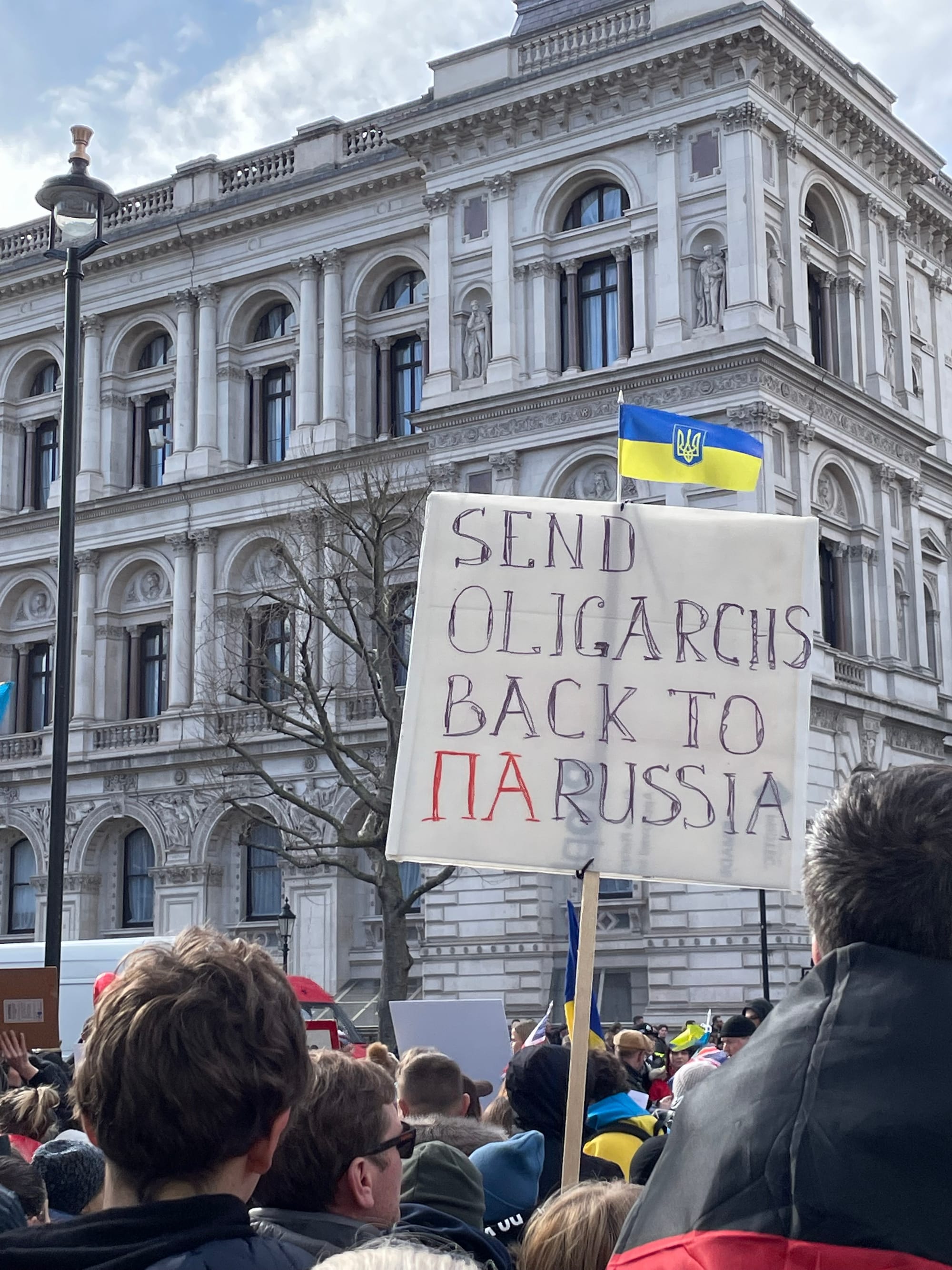 But protesters called on Number 10 to go further and hit Russia’s ability to trade by banning it from using the SWIFT international payment system. And, among the many Ukrainian flags in the crowd, were several placards demanding action against Russian oligarchs in the UK.